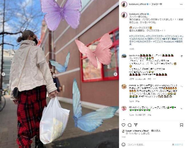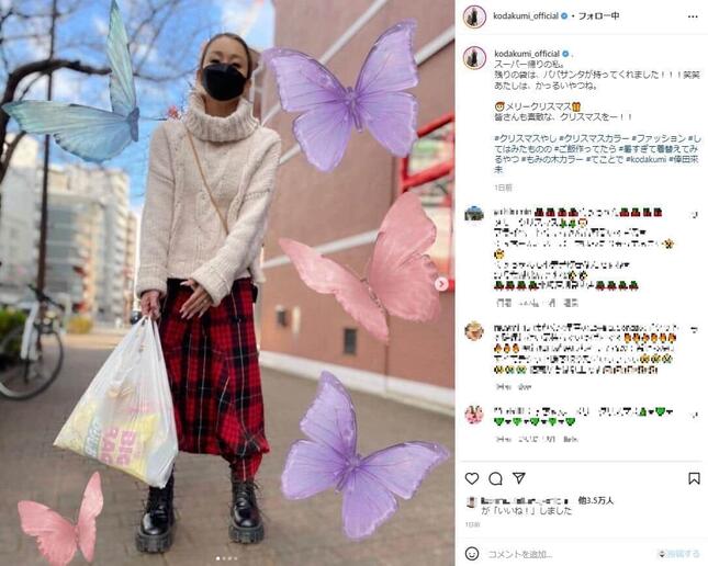 歌手の倖田來未さんが2021年12月25日、スーパーマーケット帰りのラフな姿をインスタグラムで公開した。手に持った買い物袋に入っている「意外な食べ物」に注目が集まった。