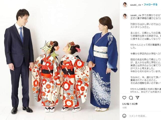 佐々木氏はブログなどに、夫でボートレーサーの中野次郎さん、14年に出産した6歳の娘、新たに養子として迎えた女児との4ショット写真を投稿し、養子縁組をしたことを伝えた。