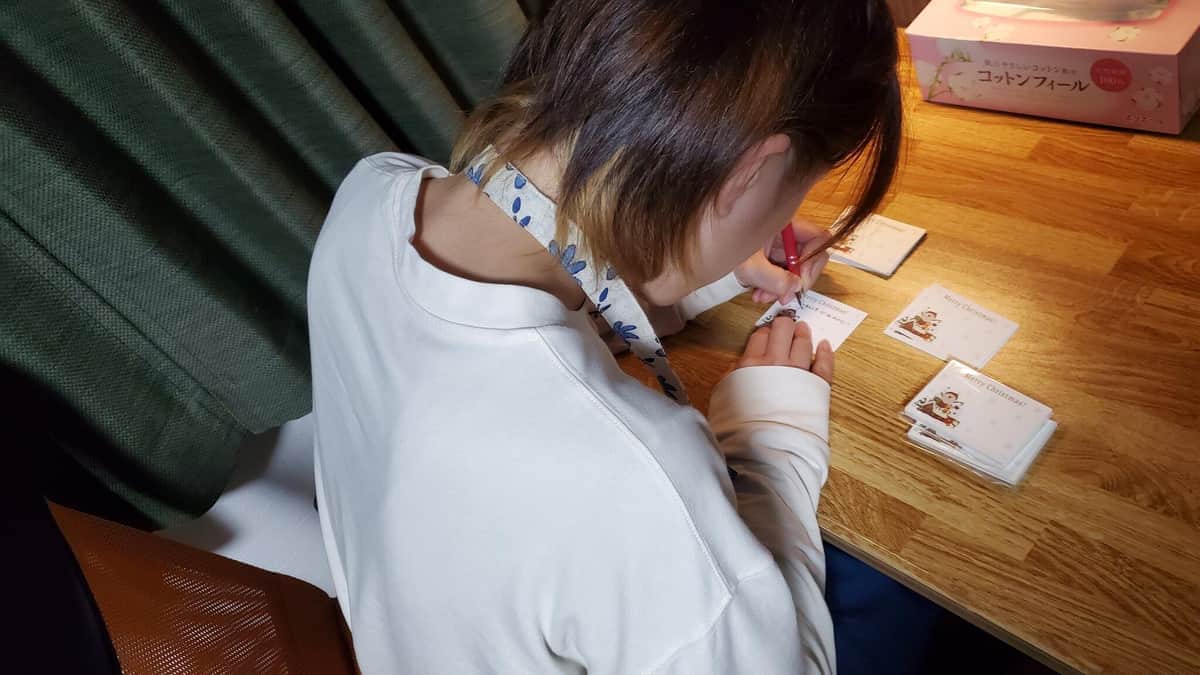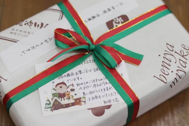 普段の商品にはつけない、メッセージカードもつけた。「たとえひとりの方でも、クリスマスを楽しんでいただけたらと思い、店の若女将が書きました」。店主の三宅さんは2021年12月27日、J-CASTニュースの取材に話す。