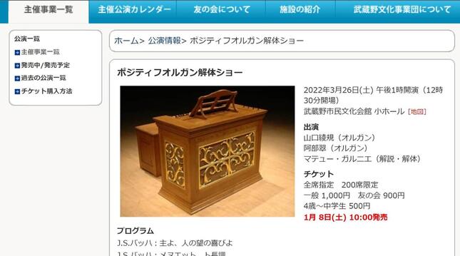 武蔵野文化事業団は3月26日に、武蔵野市民文化会館の小ホールで「ポジティフオルガン解体ショー」を開催する。イベントは2部構成。第1部では、オルガン奏者の山口綾規さんと阿部翠さんが、ホールに設置されたパイプオルガンと小型オルガンの2台で、バッハの「主よ、人の望の喜びよ」やモーツァルトの「アイネ・クライネ・ナハトムジーク」などの名曲を合奏する。