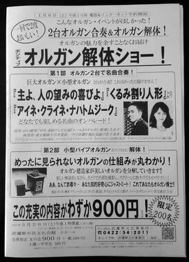 第2部では、小型のパイプオルガン「ポジティフオルガン」を「解体」するという。イベントの開催を知らせるチラシでは、「ああ、なんて赤裸々・・・あなたの知的好奇心にジャストミート!これであなたもオルガン博士!!」などと紹介されている。