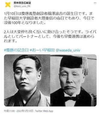 1月10日は早稲田大学の創立者・大隈重信が1922(大正11)年に没した命日で、慶應義塾の創始者・福澤諭吉が1835(天保5)年に生まれた日。2022年は大隈重信の没後100年にあたる。早稲田大学のアカウントは10日11時に