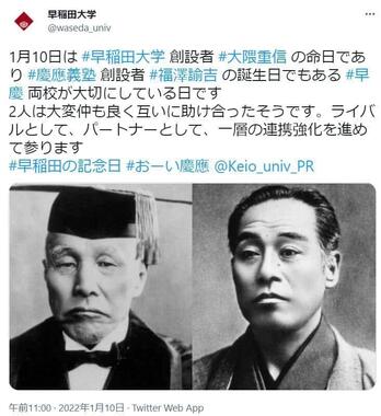 早稲田大学と慶應義塾大学のツイッターアカウントが2022年1月10日11時、同時に両校の創立者にまつわる投稿を行い、この日が両校ゆかりの日であることをアピールしている。写真位置を入れ替えた構図や「早慶」をめぐるワードの使い方も話題だ。