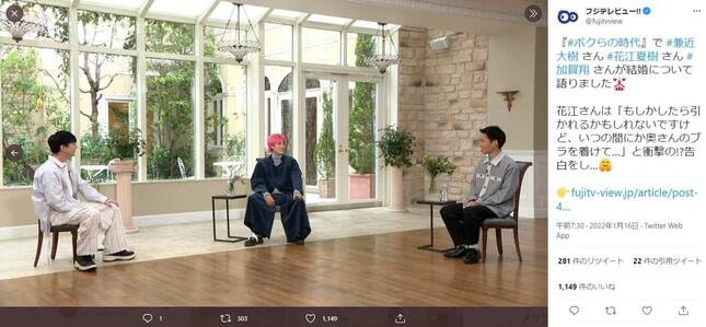 フジテレビ「ボクらの時代」に出演した(左から)花江夏樹さん、兼近大樹さん、加賀翔さん。ツイッター「フジテレビュー!!」(@fujitvview)より