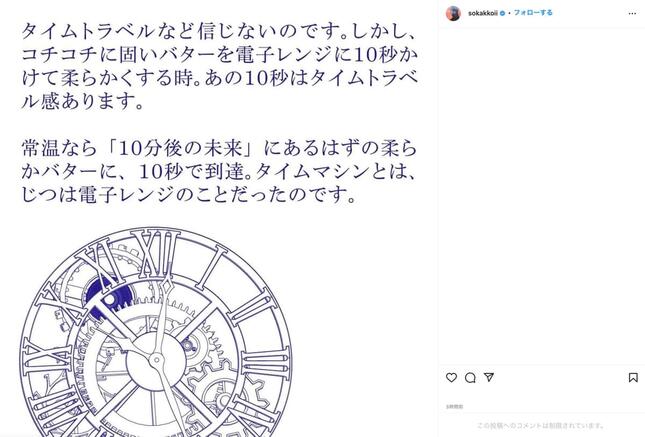 と説明しながら、「タイムマシンとは、じつは電子レンジのことだったのです」と締めた。小沢さんはインスタグラムにも同様の投稿を行なっている。