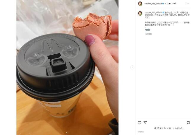 木村拓哉さんと工藤静香さんの娘でフルート奏者、モデルのCocomiさんが2021年1月18日、インスタグラムで、休憩時間に楽しんだマクドナルドのおやつ写真を公開した。