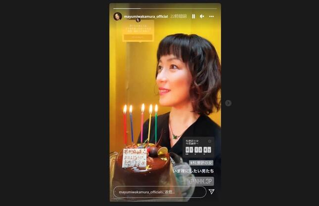 2枚目に映っているのは、カラフルなろうそくが5本立ち並び、「若村麻由美さん おたんじょうび おめでとうございます」と書かれたプレートが乗ったチョコレートケーキの写真だ。
