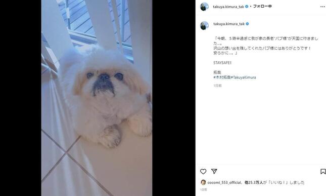 タレント・俳優の木村拓哉さん一家4人が2022年1月24日、愛犬の「バブ」が亡くなったことをそれぞれのインスタグラムで伝えた。