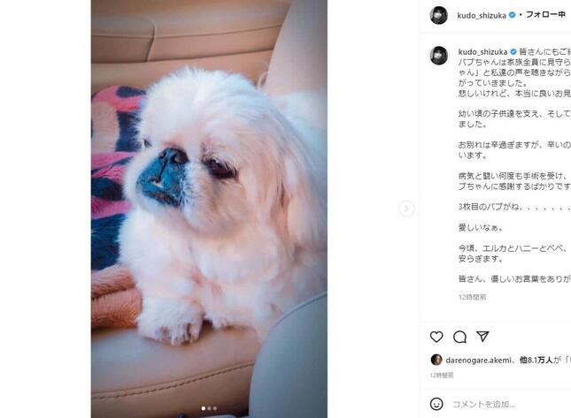 木村さんの妻で歌手の工藤静香さんも同日、3枚の写真とともに「バブ」との別れをつづった。一家全員で見送ったという。