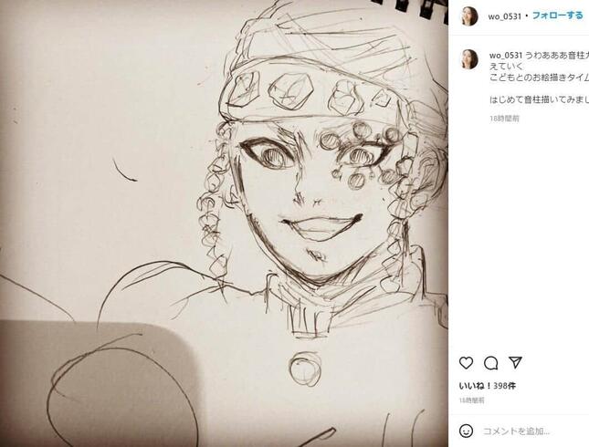 眞鍋さんは、「うわあああ音柱カッコよかった...やばいどんどん推しが増えていく」と興奮気味名コメントを添えて、『鬼滅の刃』に登場する音柱・宇髄天元の手描きイラストを公開した。