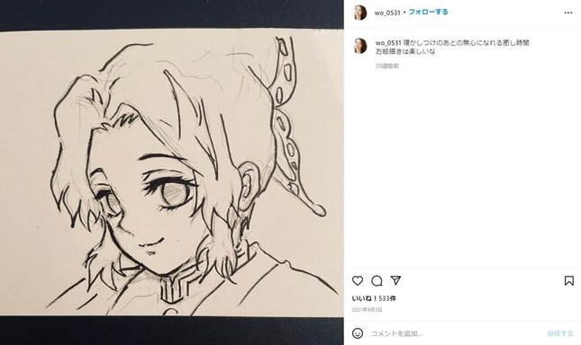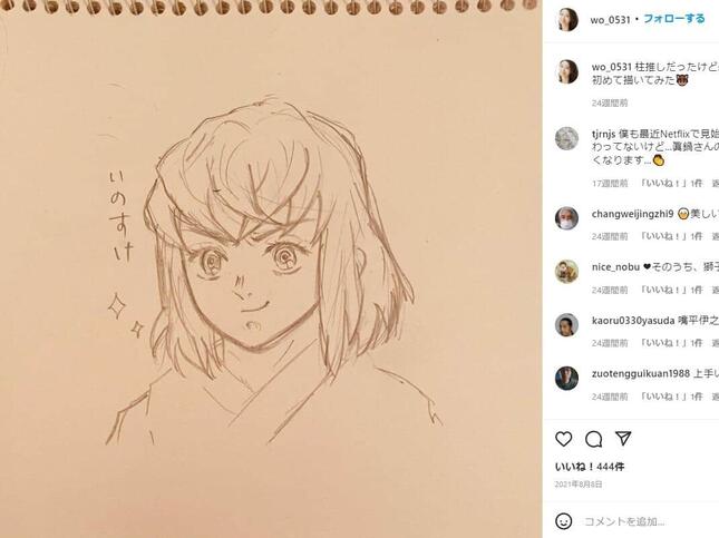 眞鍋さんは21年8月と9月にも、『鬼滅』の胡蝶しのぶや嘴平伊之助のイラストをそれぞれアップしていた。