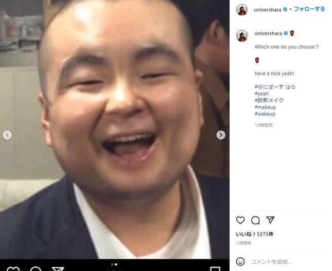 2枚目に投稿したのは、打って変わって坊主頭のはらさんの写真。コントなどでのメイクを施した姿なのか、1枚目とのギャップが大きい写真となっていた。