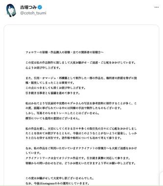 古塔さんは2月3日夕、「フォロワーの皆様・作品購入の皆様・全ての関係者の皆様方へ」と題してツイッターで投稿し、騒動について初めてコメントした。