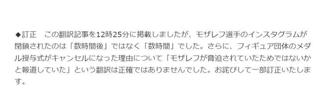 この記事について、日刊スポーツは9日夜までに、「モザレフ選手のインスタグラムが閉鎖されたのは『数時間後』ではなく『数時間』でした」と訂正。元の記事では、