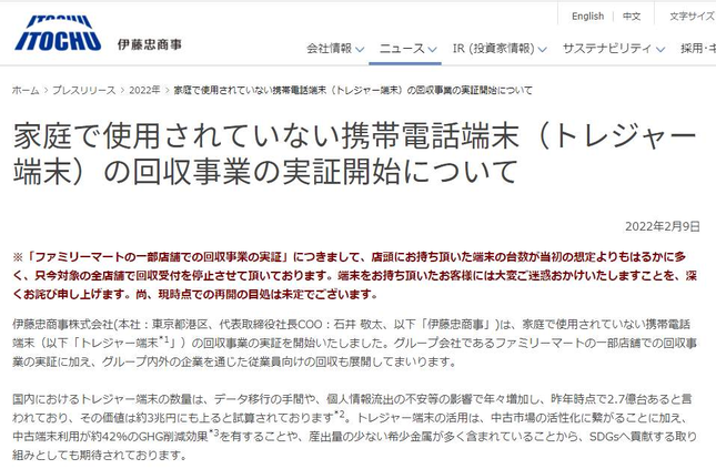 伊藤忠商事は2022年2月1日から、家に眠るスマートフォンやタブレット、フィーチャーフォンをファミリーマートで回収する実証実験を始めた。