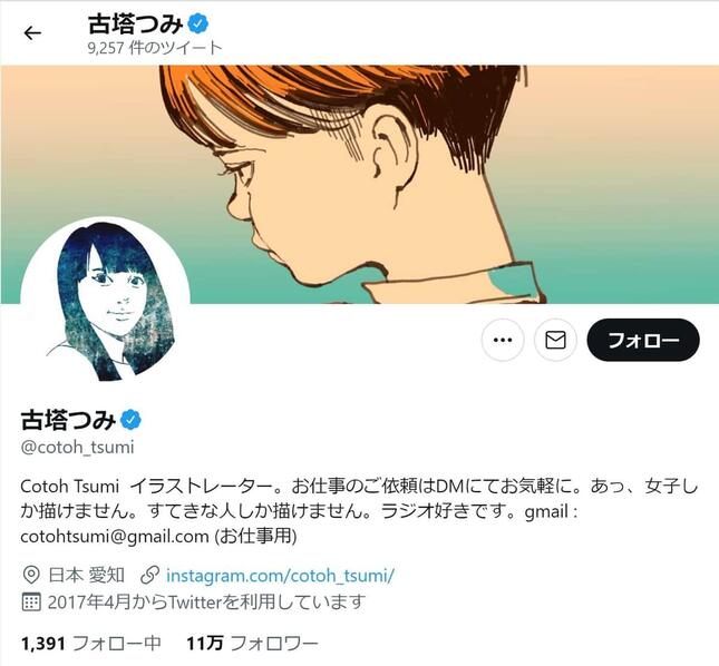 古塔さんは、「古塔つみ描き下ろし ロッキンガール」として、若い女性がギターを頭の上に乗せる様子のイラストを描くなどして作品を提供していた。