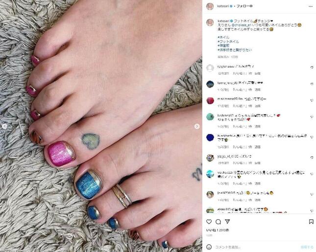 加藤さんが「フットネイル チェンジ」として公開した写真は2枚。1枚目は、黒いパーカー姿の加藤さんが上目遣いでちょこんと座っているもの。2枚目は加藤さんの両足アップの写真で、左足は青いネイル、右足はピンクのネイルが施されている。右足の親指には爪の下にハートのタトゥー、左足の甲にもタトゥーが見える。
