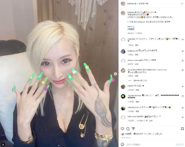 コメント欄には、「めっちゃ可愛い~」「ネイルちょうかわ」「参考にしたいです」「きゃわたーんきゃわたーん」「ジュエリーみたい」「さりちゃんにぴったり」「ネイルとタトゥーが似合いますね」「タトゥーどこでいれてますか?」などの書き込みが寄せられている。