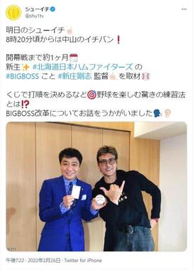 北海道日本ハムファイターズの「ビッグボス」こと新庄剛志監督は2022年2月27日放送の情報番組「シューイチ」(日本テレビ系)に出演し、番組MC・中山秀征さんと対談を行った。
