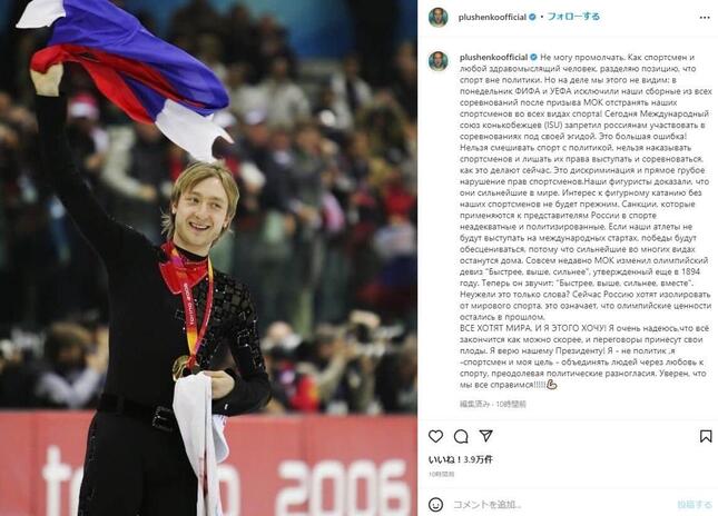 フィギュアスケートの元ロシア代表で2006年トリノ冬季五輪金メダリストのエフゲニー・プルシェンコ氏(39)が2022年3月1日にインスタグラムを更新し、スポーツ界に広がるロシア追放の流れに反発の声を上げた。