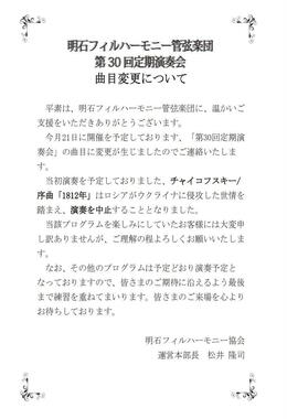 楽団は明石市立市民会館で開催予定の「第30回定期演奏会」でこの楽曲の演奏を予定していたが、3月1日に楽団を運営する明石フィルハーモニー協会(明石市)が、「ロシアがウクライナに侵攻した世情を踏まえ、演奏を中止することとなりました」と文書で発表した。