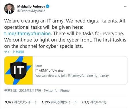 「我々はサイバー戦線で戦い続ける」--。ウクライナのフョードロフ副首相兼デジタル転換相は2月27日、「IT軍」の設立を表明し、加入者を募るとツイートした。ロシア政府機関や企業へのサイバー攻撃が目的だ。