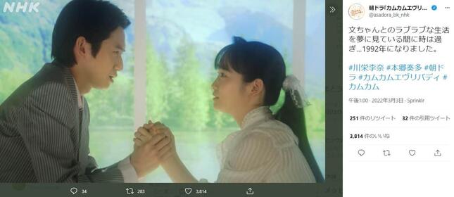 劇中の舞台は1992年に入っている。時代を感じさせる演出がツイッターで話題となり、「ひなたの前髪」がトレンド入り。「カムカムエヴリバディ」公式ツイッターも「ひなたの前髪に懐かしさを感じた人のツイートであふれていますね・・・」と驚きながら反応していた。