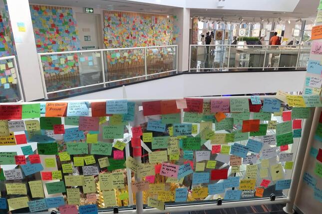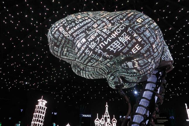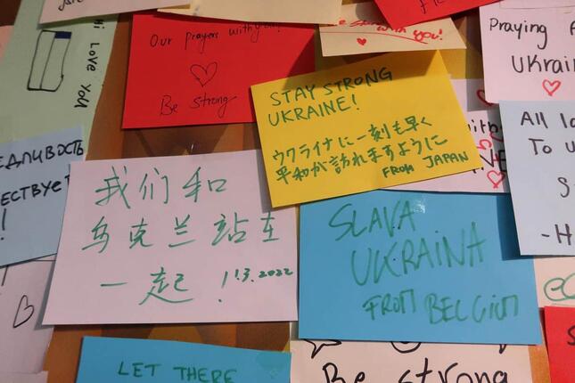 パビリオンの一角には、色とりどりの付箋を配る場所が設けられており、来場者が次々にメッセージを書き込んでいた。大半が英語で、「NO WAR」(戦争反対)「We stand with Ukraine」(我々はウクライナとともにある)いった内容が多い。建物中のありとあらゆる壁が、このメッセージで埋まっている。中には「from JAPAN」という一言とともに、日本語で「ウクライナに一刻も早く平和が訪れますように」と記したものもあった。「from JAPAN」のようにメッセージに書かれた国名は、数分間カウントして確認できただけでもUAE、ブルガリア、フランス、米国、フィリピン、ベルギー、タイ、レバノン、パキスタン、ミャンマー、パレスチナ、イラン、スペイン、カナダ、インド、ブラジル、ルワンダなどで、きわめて多様だ。観光客以外にも、万博にパビリオンを出展している各国の関係者がメッセージを残した可能性もありそうだ。