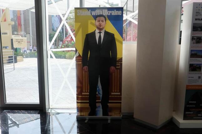 入館してすぐに入口の方を振り返ると、「ウクライナとともに」の文字が入ったゼレンスキー大統領のパネルが司会に入る -
