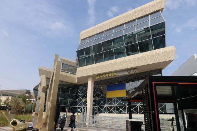 ウクライナ館の外観。国旗が目立つデザインだ -