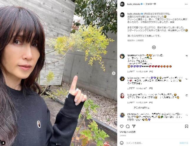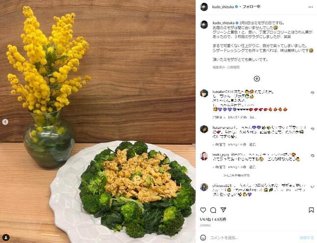歌手の工藤静香さんが、国際女性デーで「ミモザの日」と呼ばれる2022年3月8日にインスタグラムを更新し、"ミモザ風サラダ"を披露した。