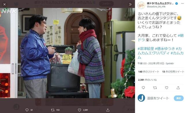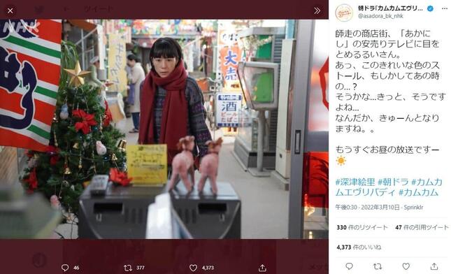 2022年3月10日放送の連続テレビ小説「カムカムエヴリバディ」(NHK)で、俳優の深津絵里さんが過去に出演したCMをオマージュした場面があったと、視聴者の間で反響を呼んでいる。