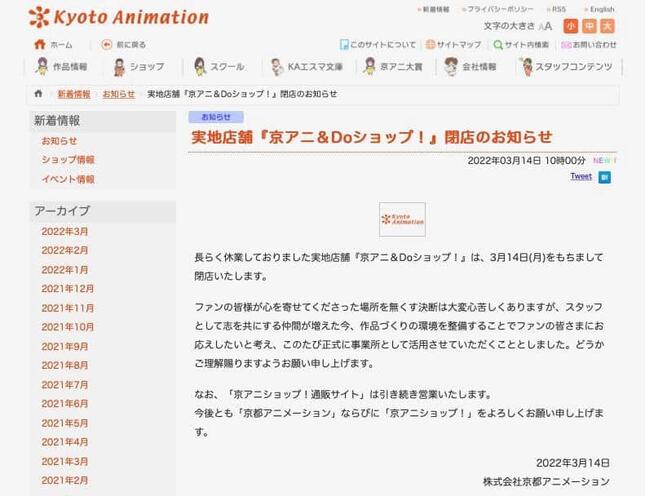 22年3月14日、京アニは同日をもってショップを閉店すると発表。「ファンの皆様が心を寄せてくださった場所を無くす決断は大変心苦しくあります」と思いを伝えた。閉店後のスペースは「スタッフとして志を共にする仲間が増えた今、作品づくりの環境を整備することでファンの皆さまにお応えしたい」と、正式な事業所として活用するとした。