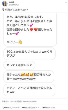 中町さんは2022年3月9日のツイッターに「度が過ぎてませんか?」という一文を添えて、「4月2日に殺害します」「テディーとベア(編注:愛犬の名前)の前で殺したるわww」などと書かれたDMの画像を公開した。