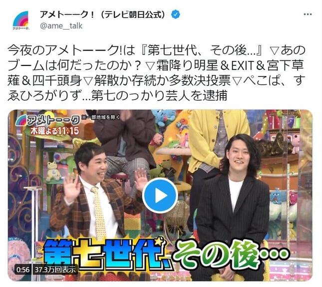 番組では、「お笑い第七世代 その後...」と題し、お笑いコンビ「霜降り明星」や「EXIT」「四千頭身」「宮下草薙」の4組が出演。ゲストに「第七世代の父」こと陣内智則さんを迎え、当時のブームを振り返るとともに、その後の葛藤などをそれぞれ明かしていく。