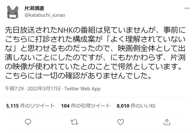 これに対し、片渕監督は17日にツイッターを更新し、直接番組は見なかったものの、自分の映像が使われていたと聞いてがく然としたと明かした。