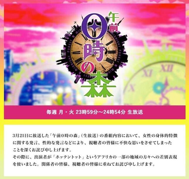 「女性の身体的特徴に関する発言、性的な発言などにより、視聴者の皆様に不快な思いをさせてしまったことを深くお詫び申し上げます。その際に、出演者が『ホッテントット』というアフリカの一部の地域の方々への差別表現を使いました。関係者の皆様、視聴者の皆様に重ねてお詫び申し上げます」