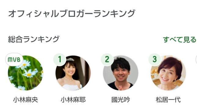 1位の小林さんの左隣には小林さんの妹で、アメブロを運営するサイバーエージェントがMVB(Most Valuable Blog)に認定した故・小林麻央さんのブログの表示もある。25日19時30分現在、アメブロのトップで確認してみると、このスクリーンショットと同一の順位だった。