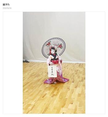 「写真」とのタイトルのエントリーには、隈取を描いた勸玄くんがかつらと着物に身を包んでポーズを決めている4枚の写真がアップされている。このうち最後のものでは下駄を履きつつ傘を構える姿で見得を切っている。一方、これの後にアップされた「麗禾も」とのエントリーでは、やはりかつらと着物に身を包み、傘を構えつつポーズを決める麗禾さんの写真がアップされている。