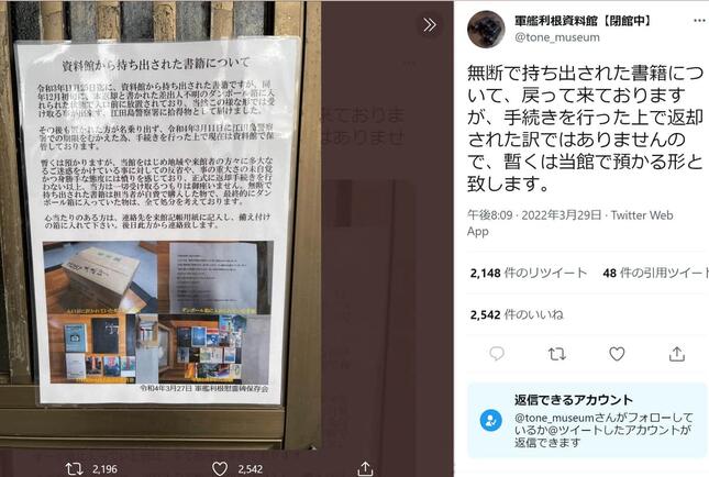 閉館していた軍艦利根資料館(広島県江田島市)のもとに、無断で持ち出されていた書籍が匿名で返却された。資料館は2022年3月29日、心当たりがあれば連絡するよう、ツイッターで呼び掛けた。正式な返却手続きを行わなければ書籍を処分するという。