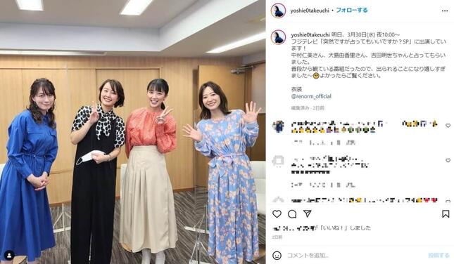 この日の放送の序盤では、竹内アナのほか、大島由香里さん(38)、吉田明世さん(33)、中村仁美さん(42)という元局アナで現フリーアナウンサーの4人が一堂に会し、占い師による手相鑑定を実施。その際、竹内さんについての暴露合戦が始まったのだ。
