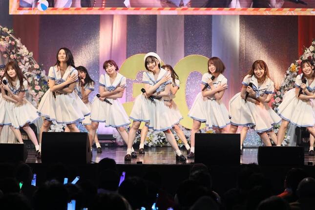 大場さんは9期生では唯一の現役メンバー。大場さんの卒業で今後はメンバーがステージに集まる機会がなくなる、という声には、島崎さんが右腕を突き上げながら「じゃあ私が復活しましょう」。大場さんが「絶対一言もしゃべんないと思ってたのに!」と目を丸くすると、自信ありげに「爪痕残さないと、爪痕!」と応じていた。