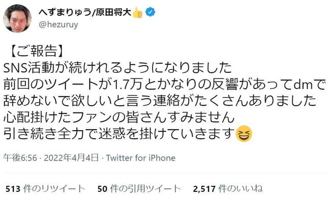 へずまさんは「前回のツイートが1.7万とかなりの反響があってdmで辞めないで欲しいと言う連絡がたくさんありました」とファンからの声に触れ、「心配掛けたファンの皆さんすみません」と謝罪。最後には「引き続き全力で迷惑を掛けていきます」と明かしている。