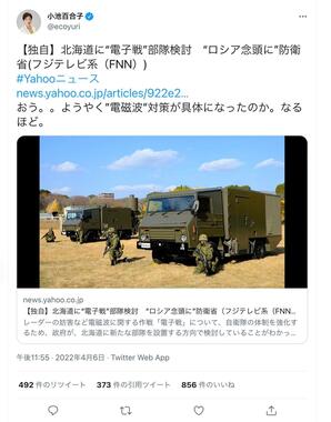そうした中、小池氏のツイッターは7日0時前、ロシアからの攻撃を念頭に、北海道に「電子戦」を想定した部隊の配置を検討しているというニュースに「おう。。ようやく"電磁波"対策が具体になったのか。なるほど。」と反応。