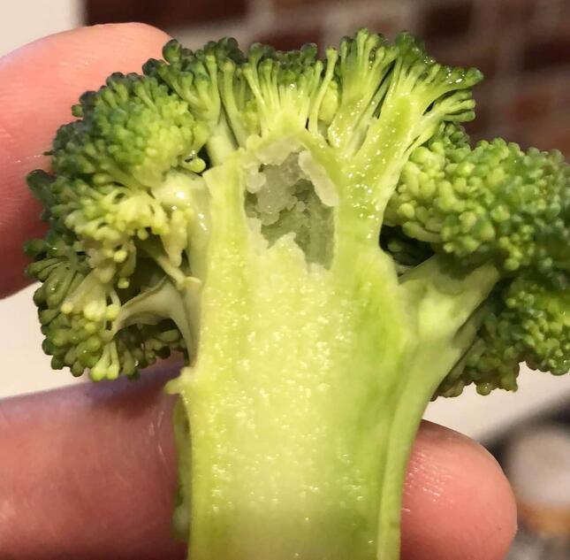 ブロッコリーを切ると、茎の上部にぽっかりと穴があった。内側には白の半透明でぶつぶつしたものが見られた。虫の卵ではないかと疑ったへいさん。空洞部分を捨て、他のブロッコリーの様子も確認した。すると、ほとんどのものが同じ状態だった。