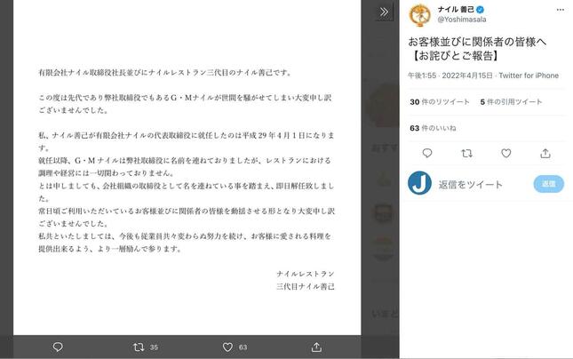 店の三代目で有限会社ナイル代表取締役社長の善己氏は、15日14時前に「お客様並びに関係者の皆様へ【お詫びとご報告】」と題した文書をツイッターに投稿。「この度は先代であり弊社取締役でもあるG・Mナイルが世間を騒がせてしまい大変申し訳ございませんでした」と謝罪した。
