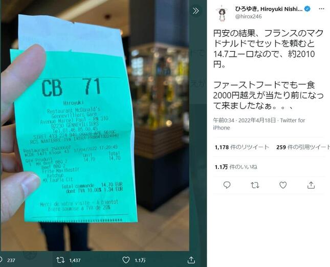 ひろゆきさんは投稿で「円安の結果、フランスのマクドナルドでセットを頼むと14.7ユーロなので、約2010円」と呟きながら、現地マクドナルドのレシート画像を公開した。