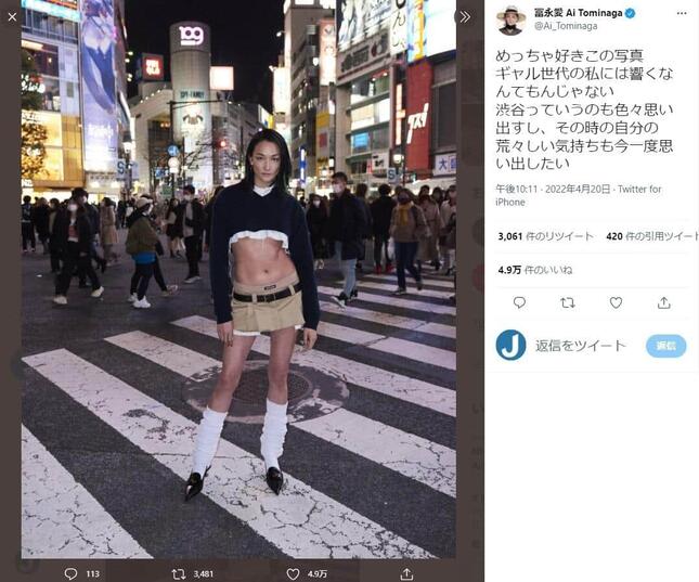 冨永さんはツイッターに、「めっちゃ好きこの写真」と紹介しつつ、渋谷109をバックに撮影した自身の写真を公開した。トップスの丈は短く引き締まったお腹を大きく露出している。ルーズソックスや極端に丈の短いスカートなど、ギャルスタイルを連想させる一枚となっていた。
