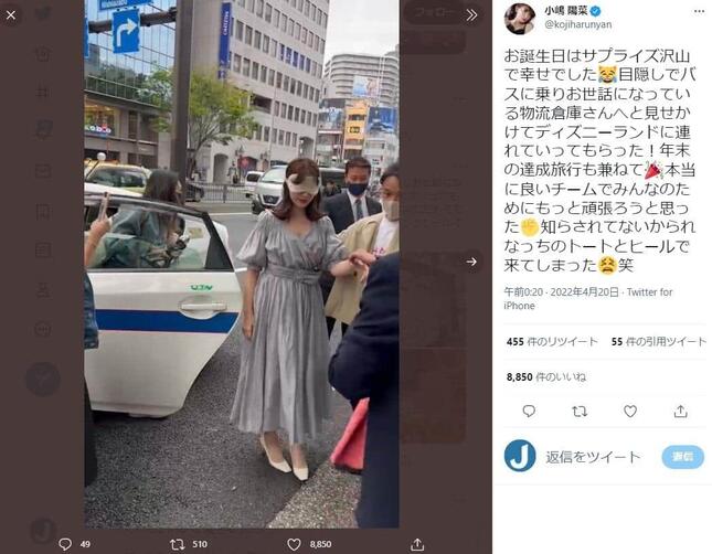 小嶋さんは4月20日、自身のツイッターで「お誕生日はサプライズ沢山で幸せでした」と投稿。「目隠しでバスに乗りお世話になっている物流倉庫さんへと見せかけてディズニーランドに連れていってもらった!」と、自身がアイマスクを着用し手を引かれる様子を映した写真を披露した。