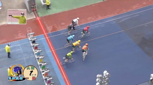 7人の選手が号砲とともに発走機から飛び出す。外枠の7番・藤原悠斗選手がペダルを一漕ぎすると、出遅れた6番の選手を追い越し、内側を走る5番・高橋佑輔選手へ急速に近づく。そのまま横から突っ込むように衝突。